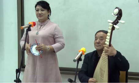 第三个环节:王青先生、梁梅女士一同上台,先后演奏了《九连环》《掐蒜苔》《张生戏莺莺》《开茶馆》;在此过程中,吕政轩教授对相关知识点进行了补充和讲解。